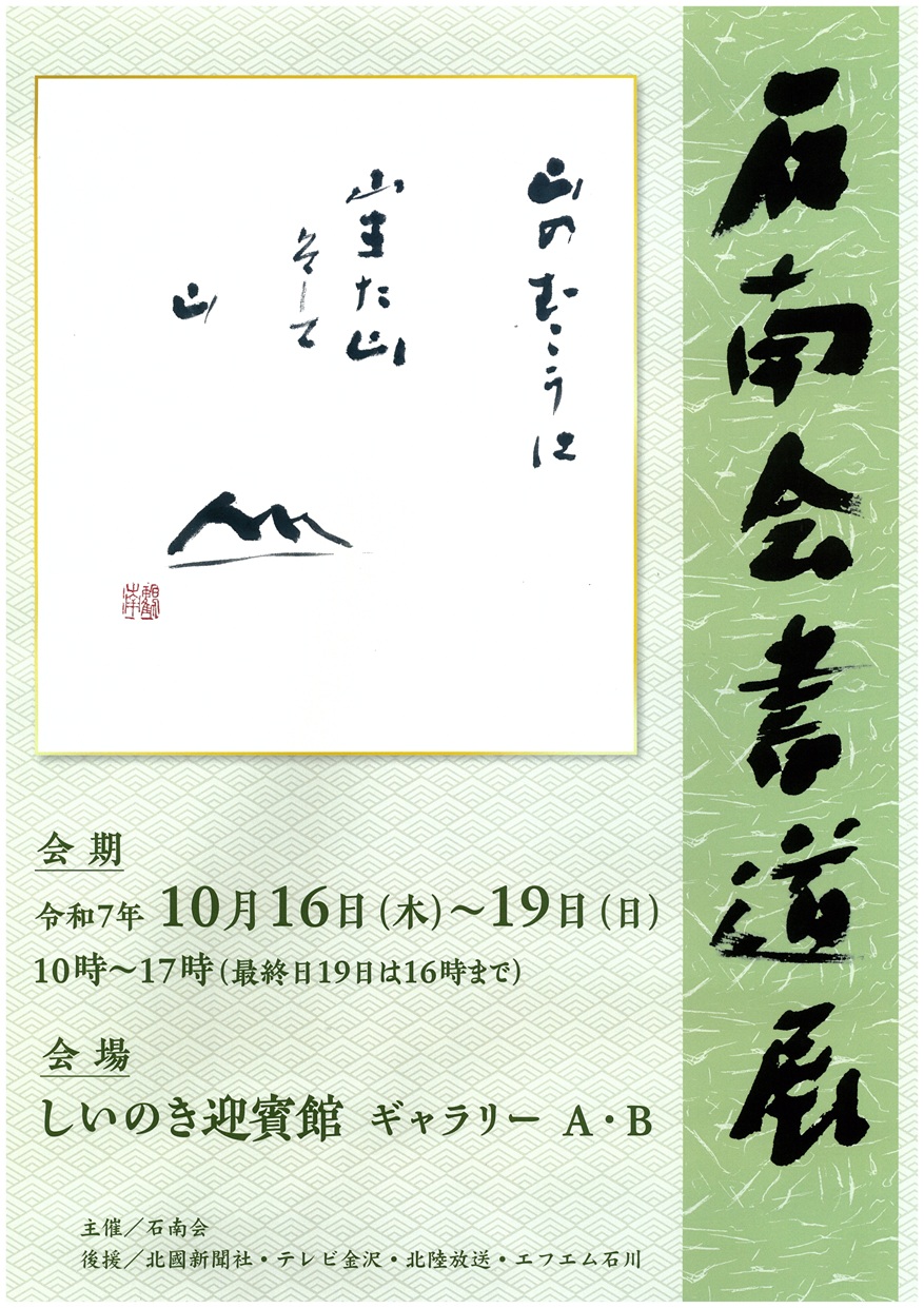 一般主催展 石南会 書道展 開催期間 2025年10月16日(木)~10月19日(日) 開催時間 10:00~17:00(最終日は16時迄) 会場 ギャラリーA・B 料金 入場無料 【主 催】石南会 【後 援】北國新聞社 / テレビ金沢 / 北陸放送 / エフエム石川 一覧に戻る トップページ イベント一覧 石南会 書道展 イベント TOP